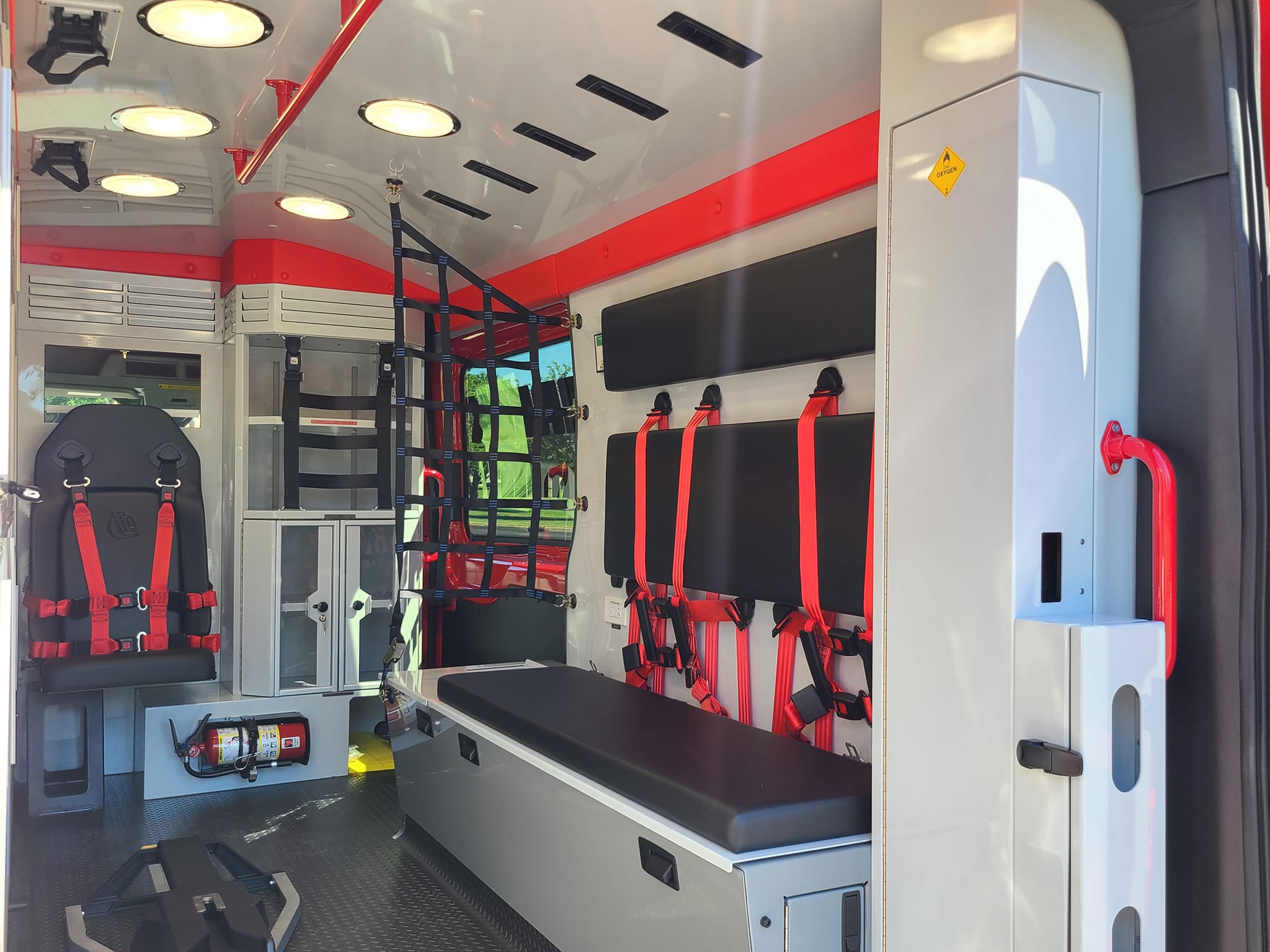 | Whelen LED emergency lighting, Whelen dual tone siren, Whelen Howler low frequency siren, VanGuard bull bar with LED flood light, Demers Multiplex Electrical System, Demers clever cabinetry, Custom interior colors, Drop thru waste and sharps containers, Recessed portable oxygen storage, Stryker Performance Load, custom graphics |