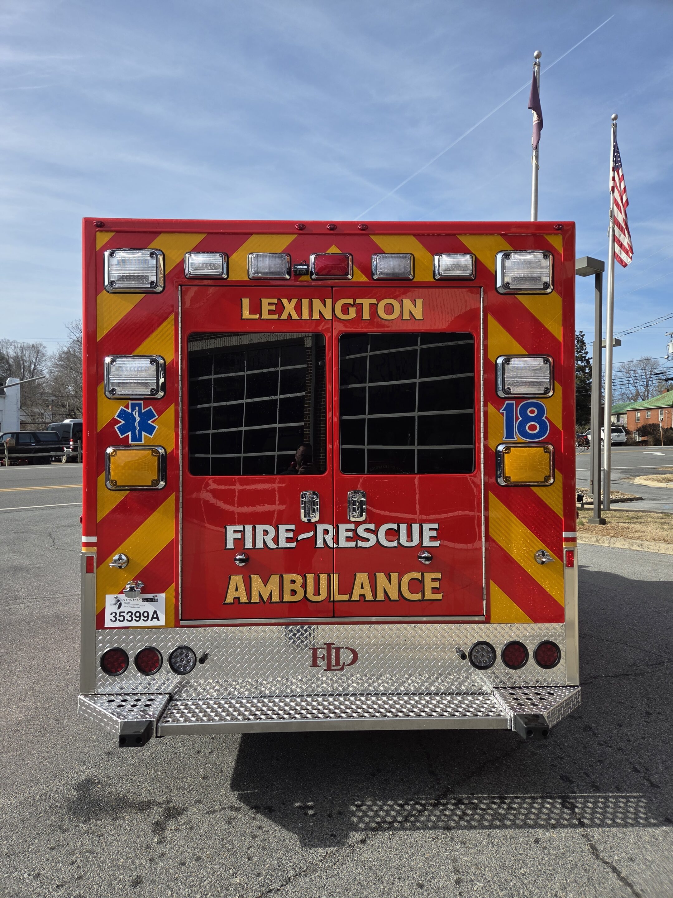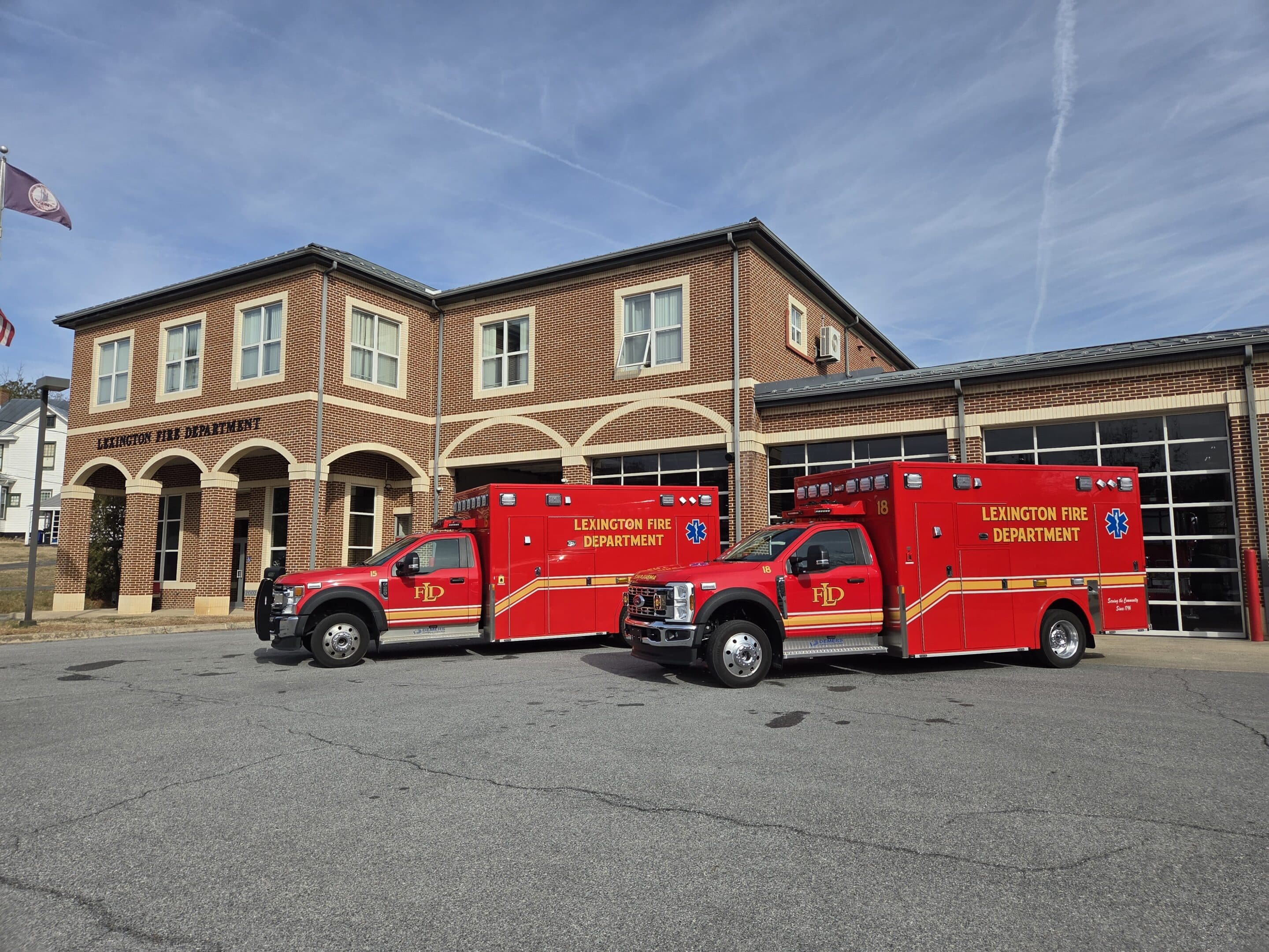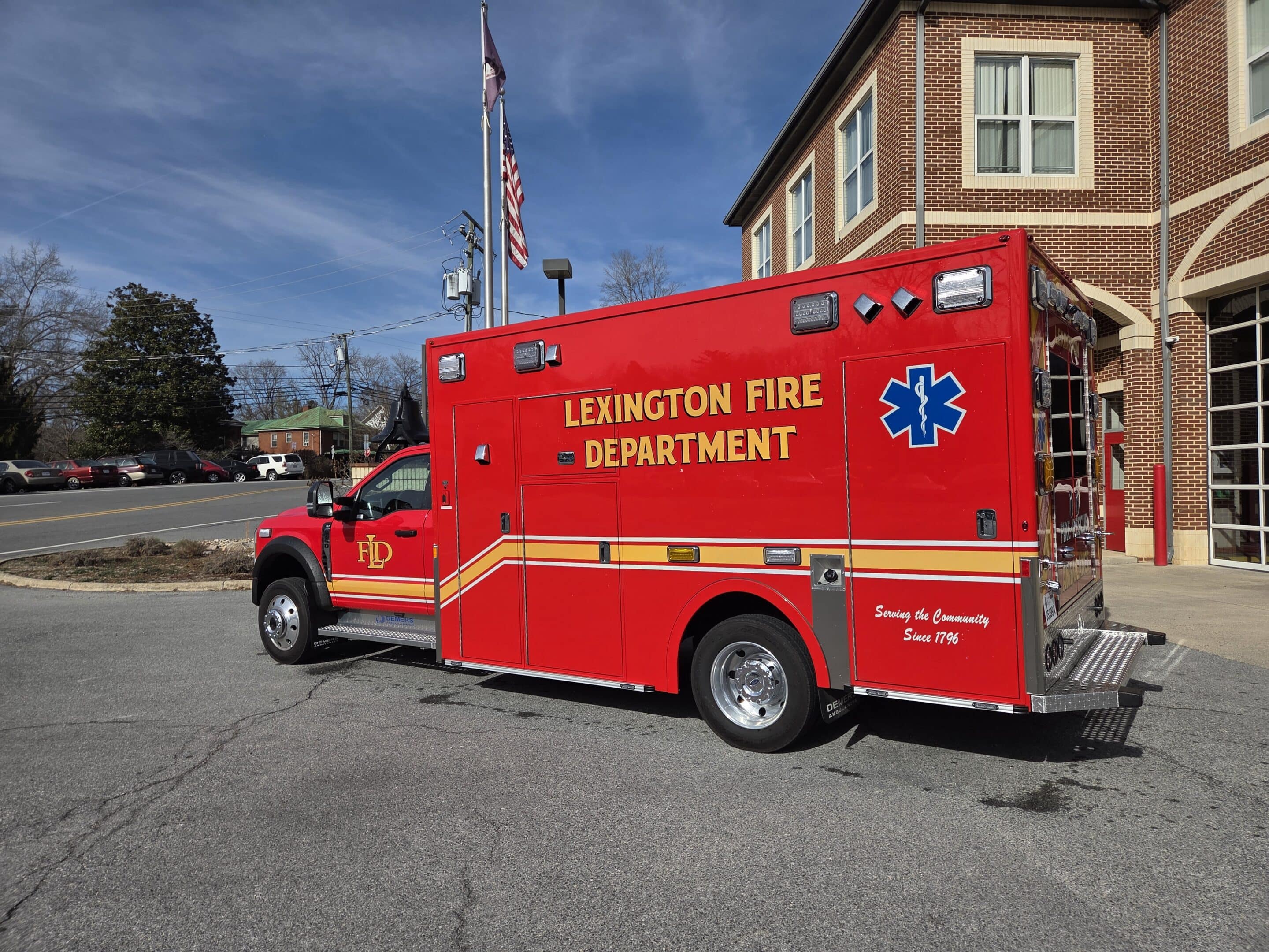 Second Demers MXP170 ambulance in service to the Lexington Fire Department in Lexington, VA.   This Type I ambulance features a Ford F-450 4×4 gasoline-powered chassis, 170″ module with 72″ interior headroom, plenty of exterior storage for firefighting equipment, custom locking drug storage cabinet and drawer, upgraded AC system, Firetech HiViz forward brow lights, laser cut LFD logo in rear step, and much more.