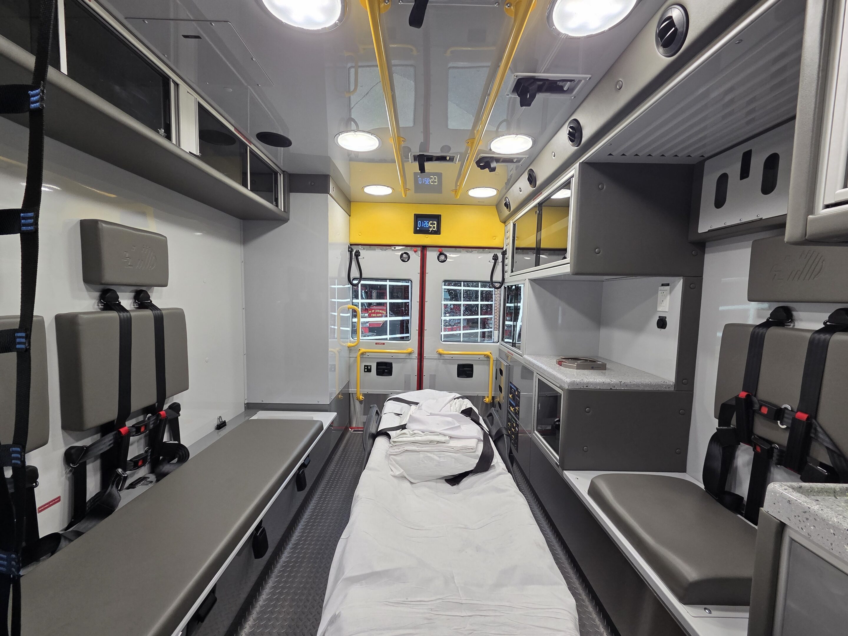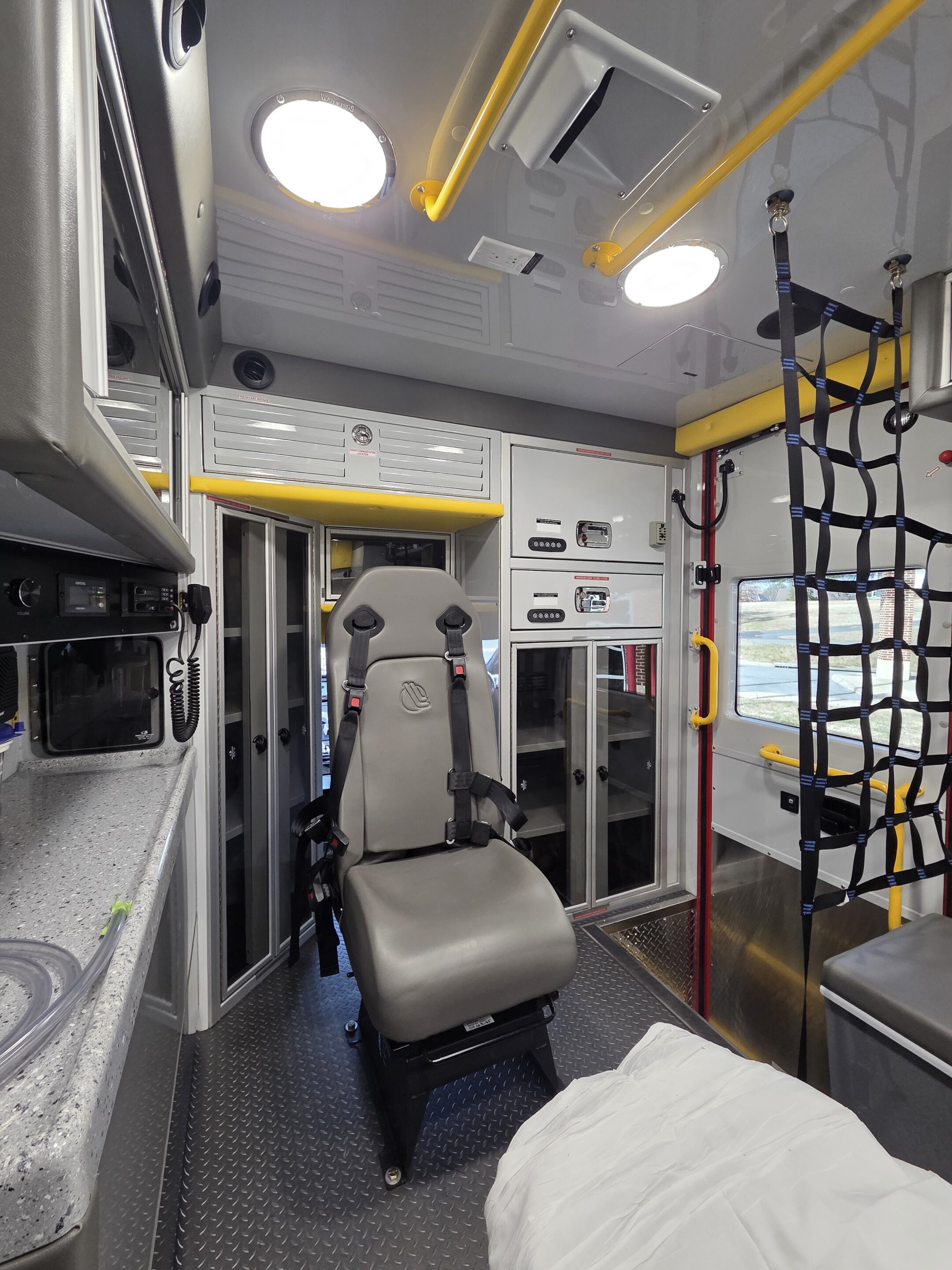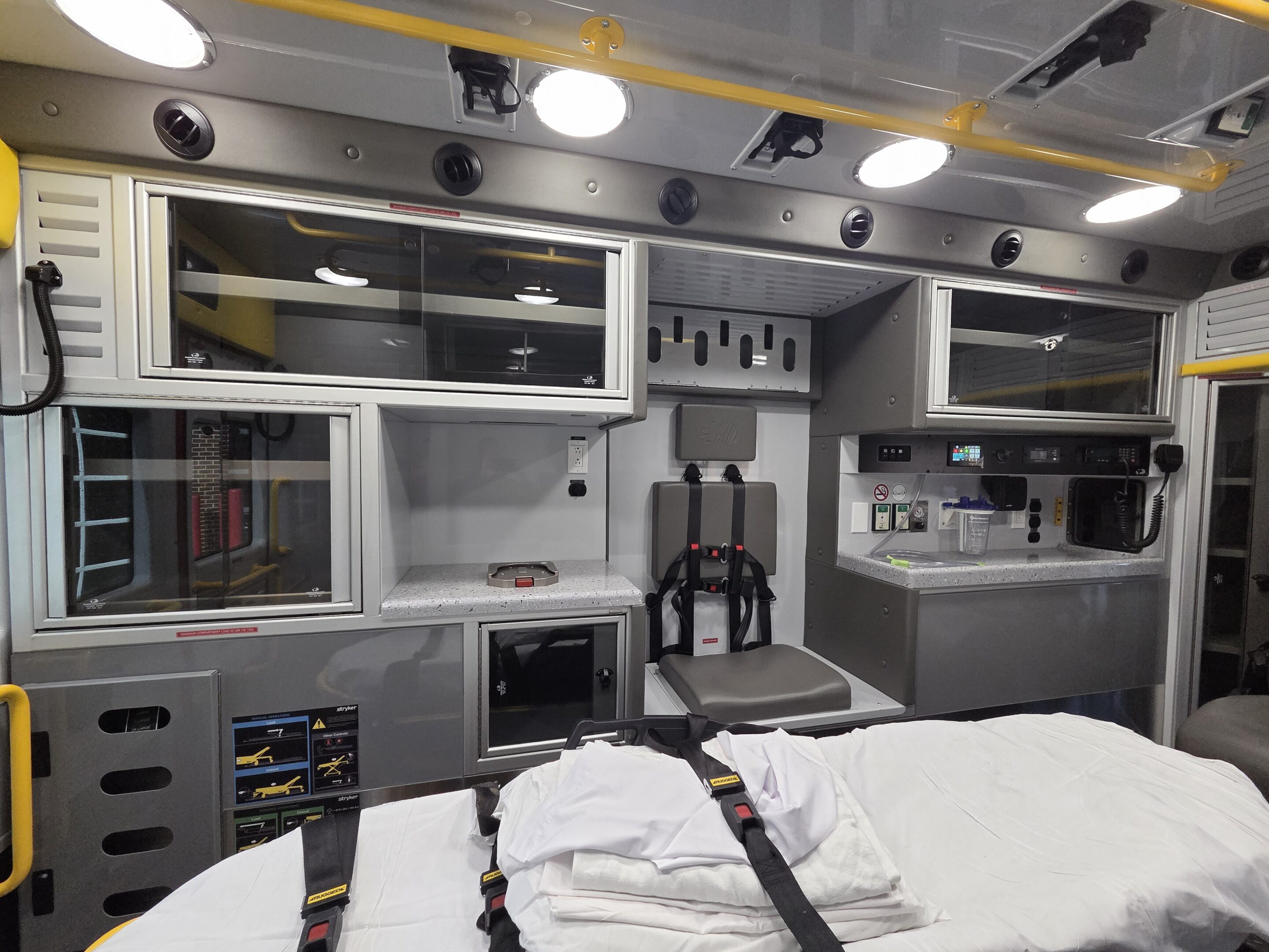 72″ head room, 170″ long module, inverter, upgraded AC system, custom locking drug cabinet and drawer, large compartments, powder-coated aluminum interior, Firetech HiViz forward brow lights, EcoSmart anti-idle system