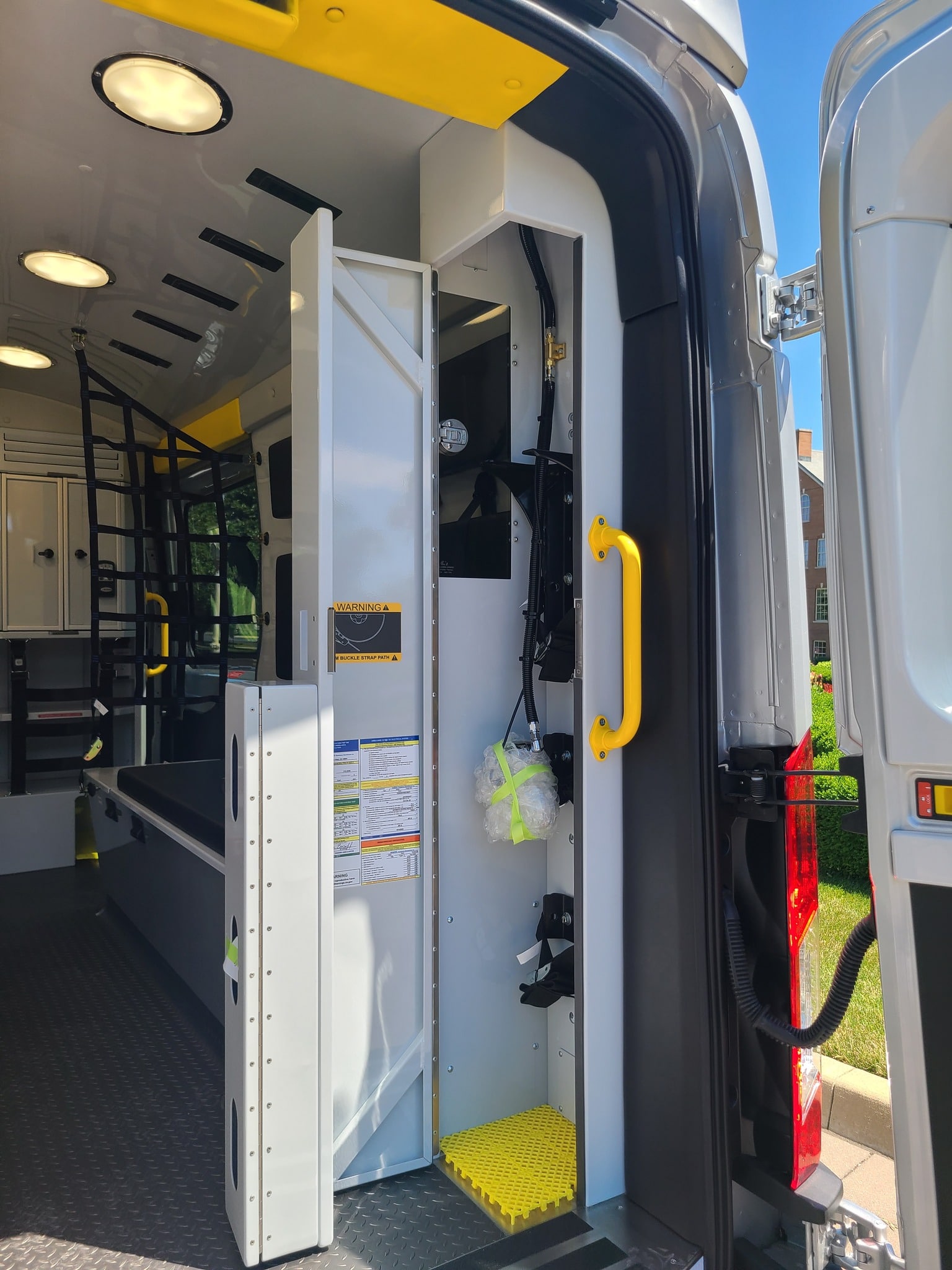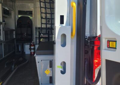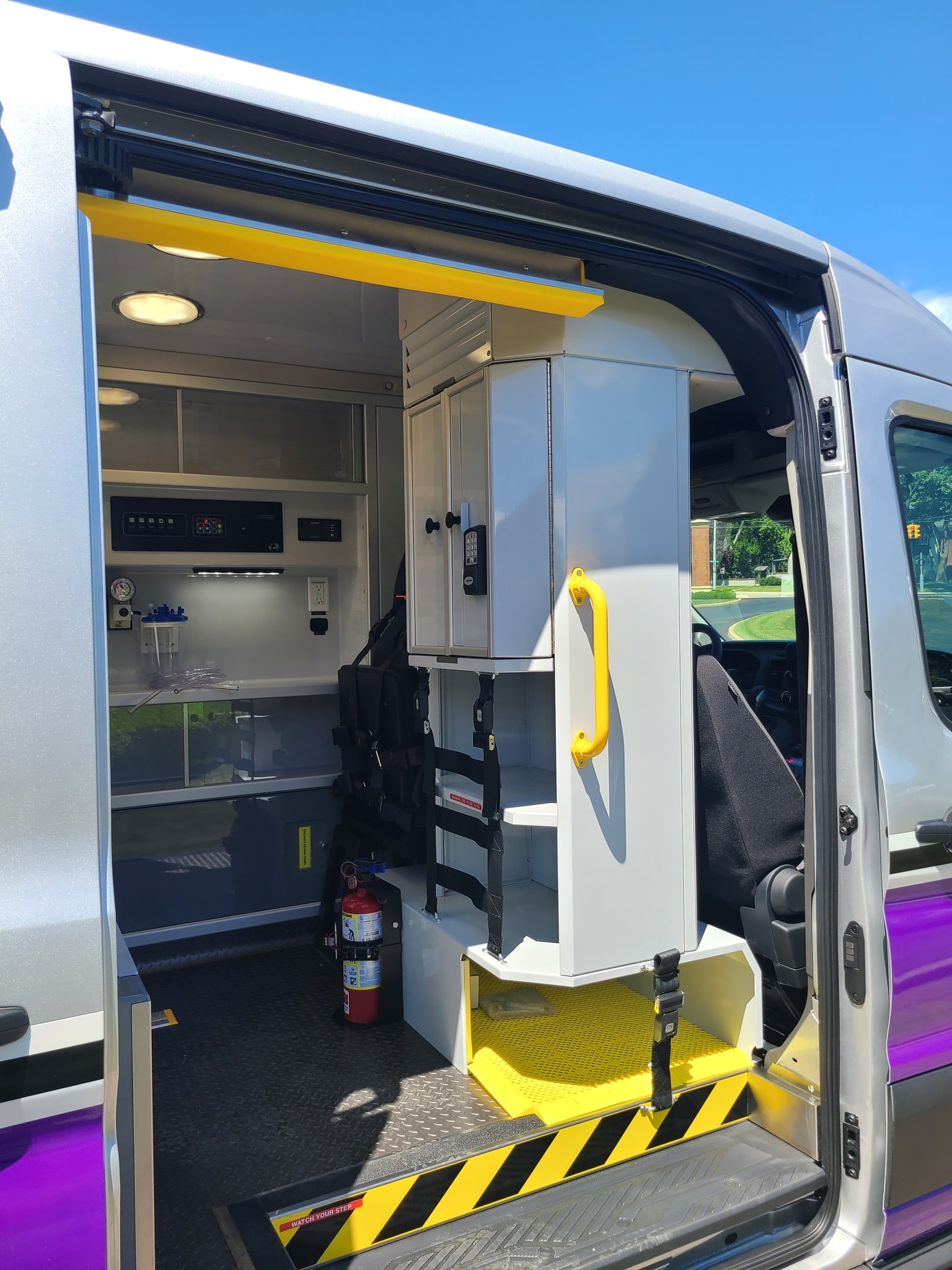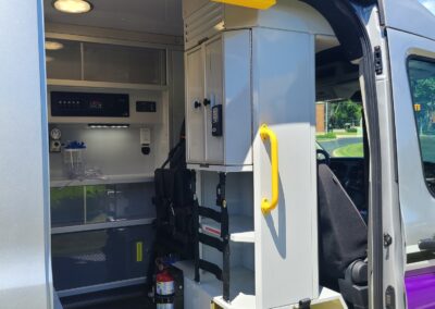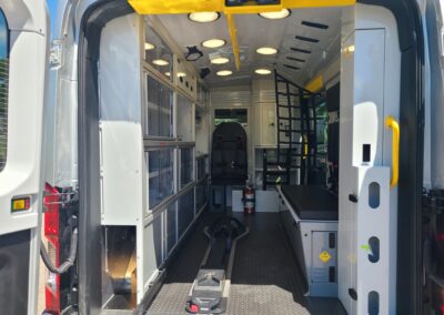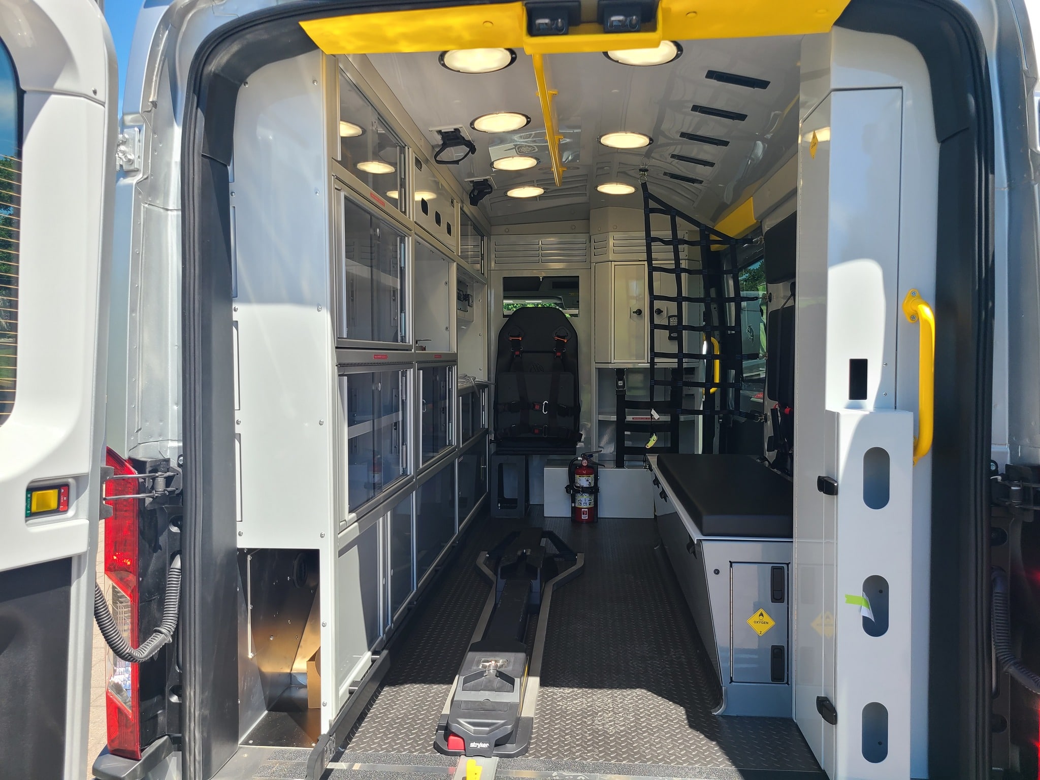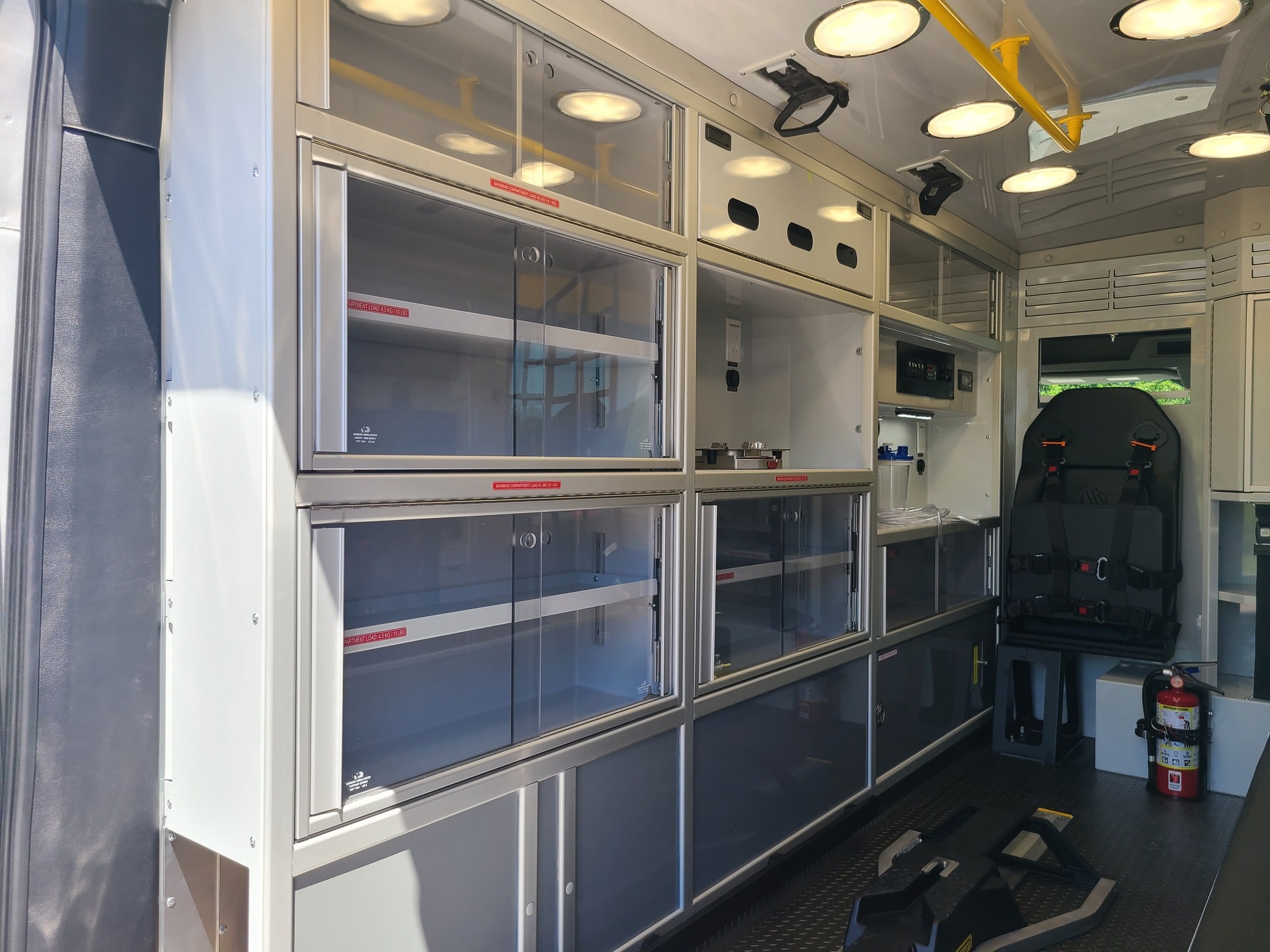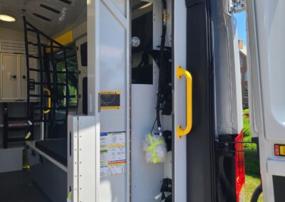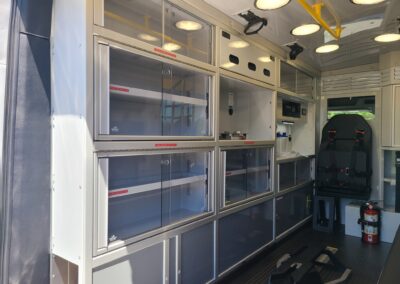 VanGuard bull bar with LED flood light, Whelen LED lighting, Demers Multiplex Electrical System, Demers clever cabinetry, Drop-thru waste and sharps, Portable oxygen storage in bench seat, Electronic drug box lock, Technimount cardiac monitor mount, Easy access stair chair location, Stryker Performance Load, Tons of glove storage