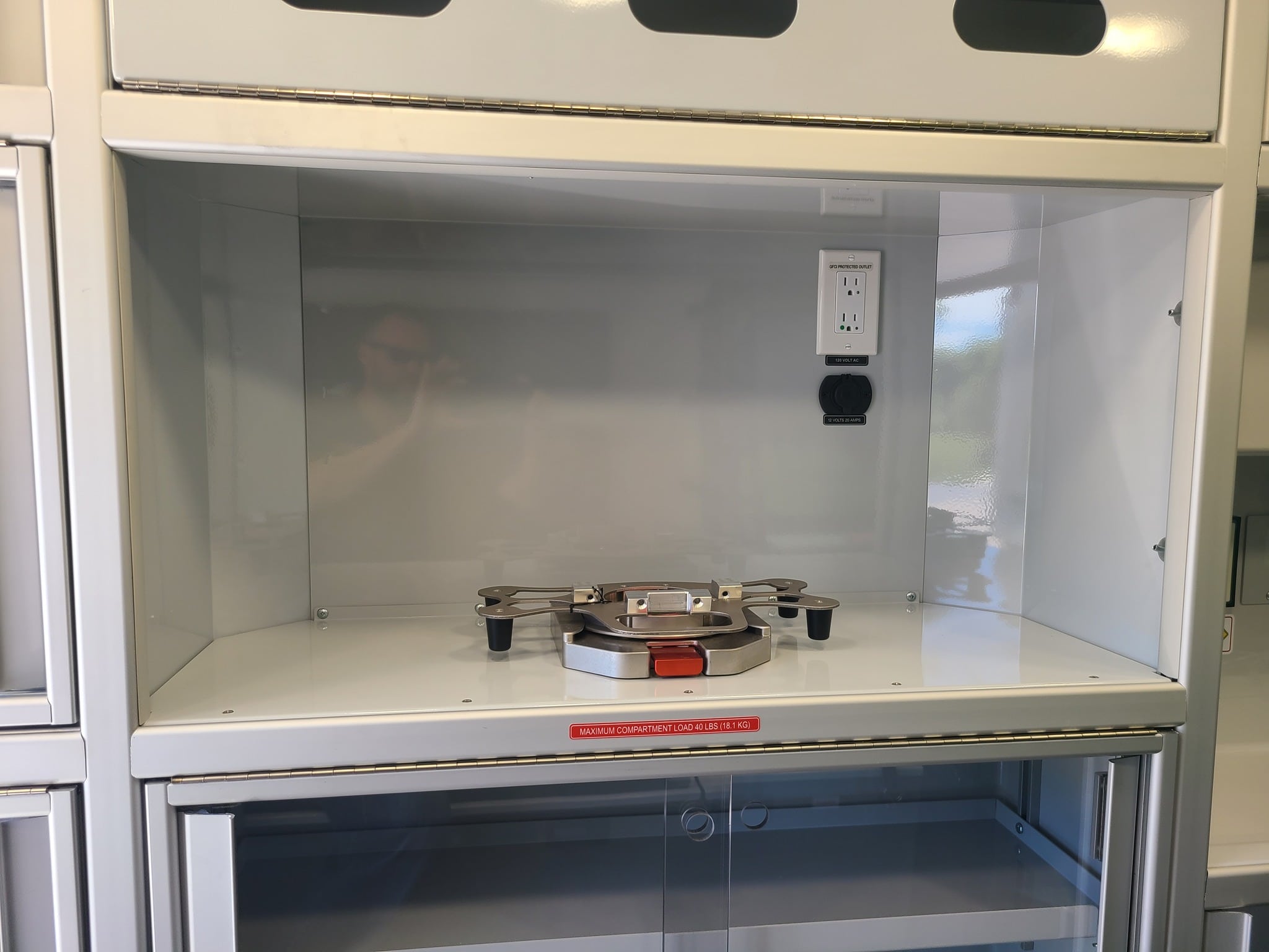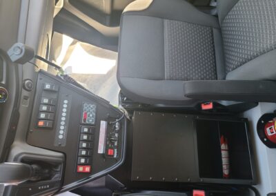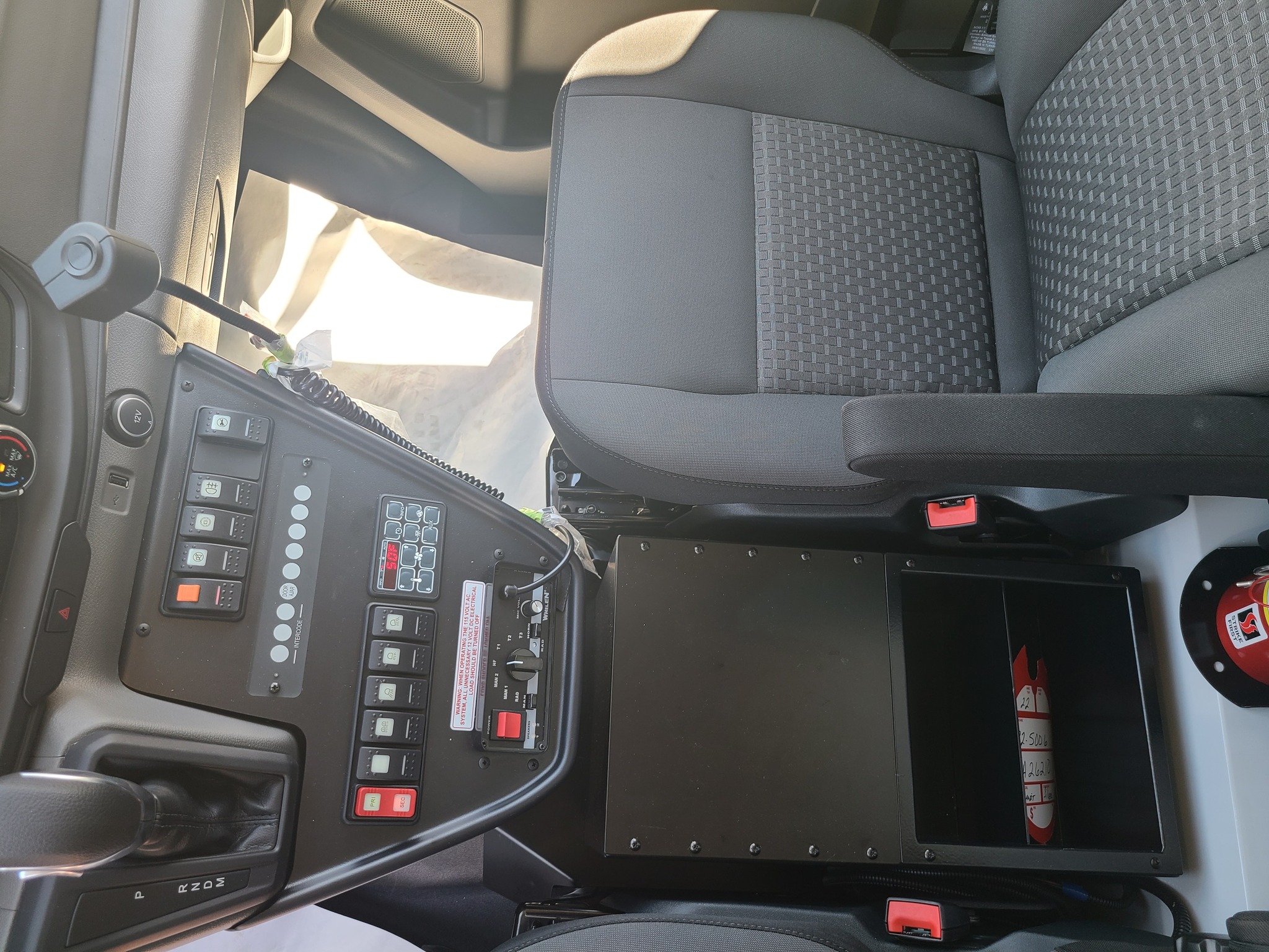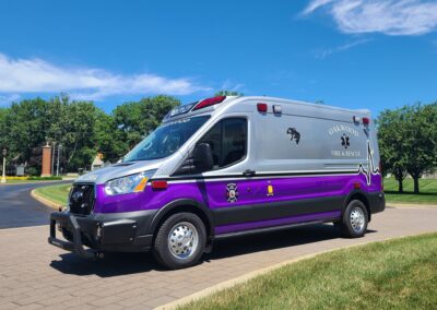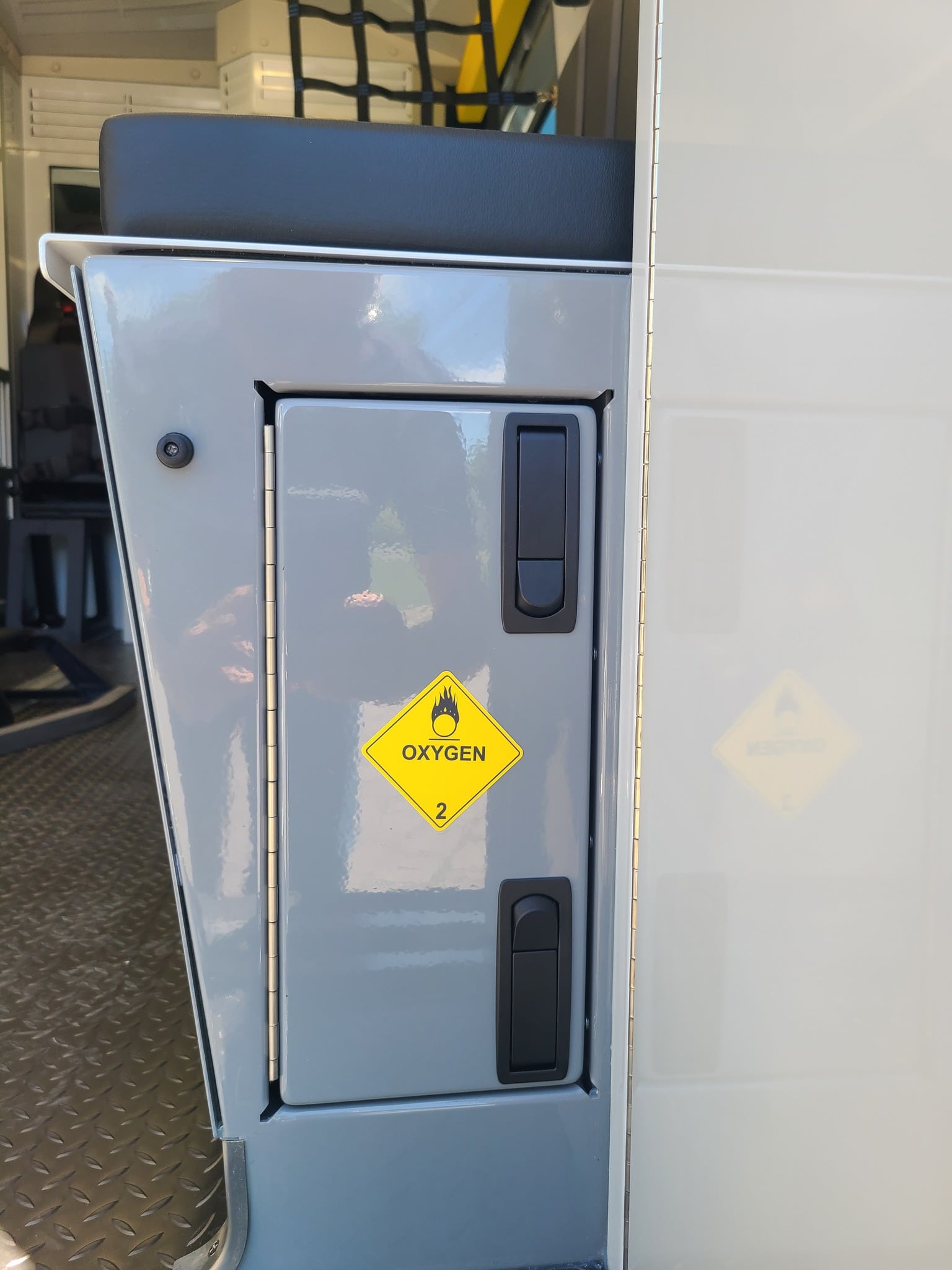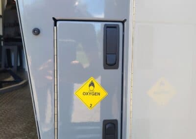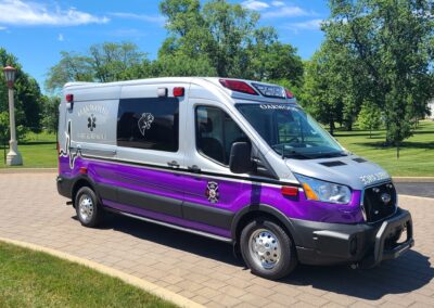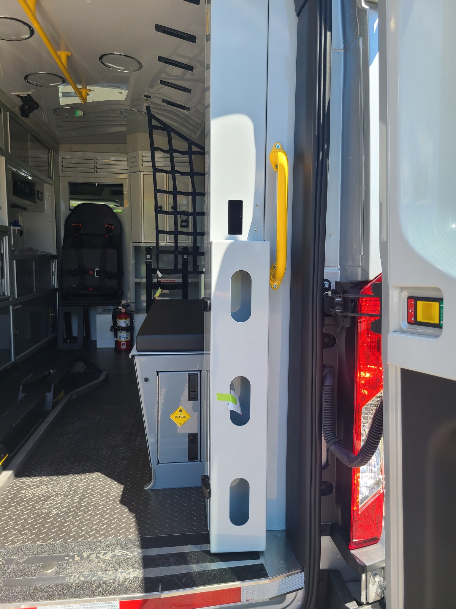 VanGuard bull bar with LED flood light, Whelen LED lighting, Demers Multiplex Electrical System, Demers clever cabinetry, Drop-thru waste and sharps, Portable oxygen storage in bench seat, Electronic drug box lock, Technimount cardiac monitor mount, Easy access stair chair location, Stryker Performance Load, Tons of glove storage